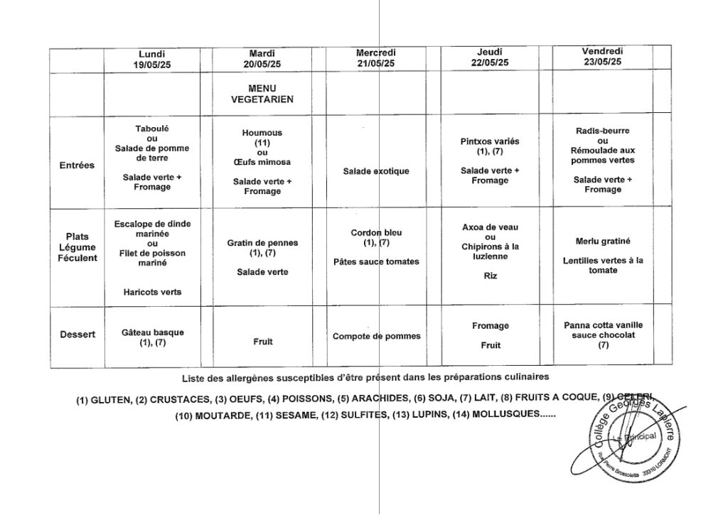 Menus semaine du 19/05/2025